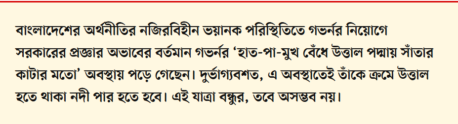 বাংলাদেশের অর্থনীতির নজিরবিহীন ভয়ানক পরিস্থিতিতে গভর্নর নিয়োগে সরকারের প্রজ্ঞার অভাবে বর্তমান গভর্নর ‘হাত-পা-মুখ বেঁধে উত্তাল পদ্মায় সাঁতার কাটার মতো’ অবস্থায় পড়ে গেছেন। দুর্ভাগ্যবশত, এ অবস্থাতেই তাঁকে ক্রমে উত্তাল হতে থাকা নদী পার হতে হবে। এই যাত্রা বন্ধুর, তবে অসম্ভব নয়।